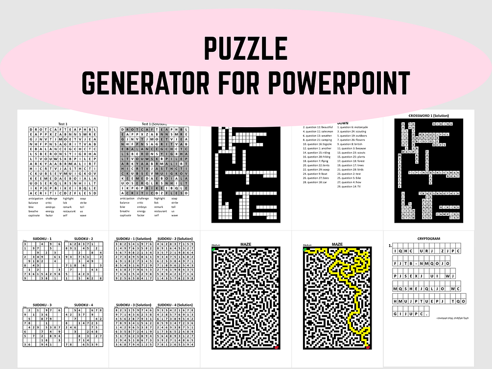 Quickly bulk create word searches, crosswords, mazes, sudoku, colouring book pages, cryptogram, word puzzles, word scramble puzzles, mine finder, warship puzzles, hangman puzzles, tic tac toe grids, tic tac toe logic puzzles, nurikabe puzzles, Hitori puzzles, 4 in a row grids, skyscraper puzzles & ABC Path puzzles for multiple page sizes. All puzzles include instructions. Works on PC & Mac. PowerPoint 2013 and newer (up to 2020) future updates are likely but not guaranteed.