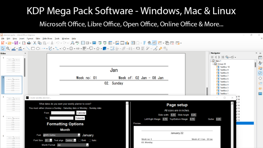 Create a weekly planner (ALL TRIM SIZES) with the ability to customise fonts and date format.