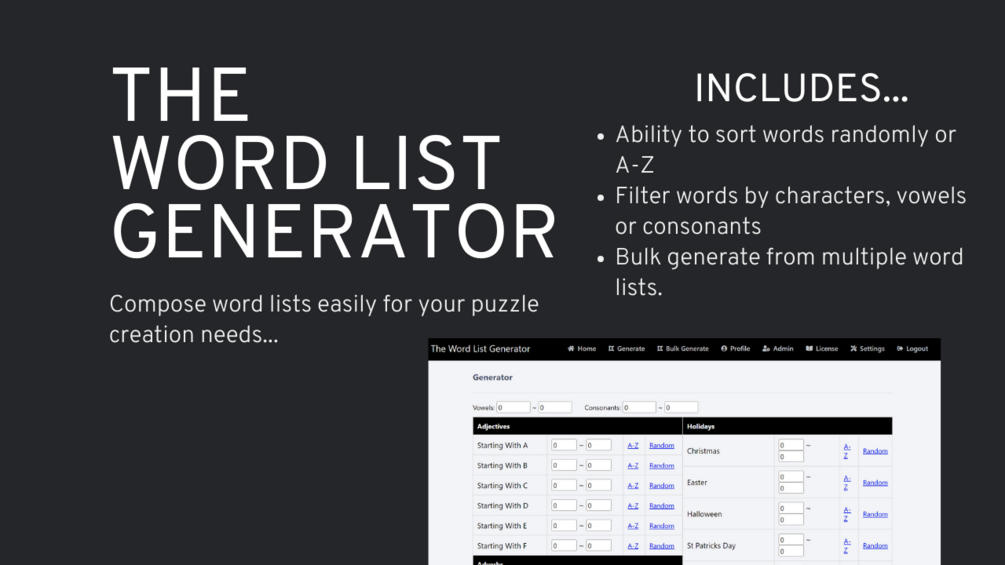 This tool is an easy way to generate various word lists for puzzle generation including filtering features such as number of characters, consonants and vowels. The tool also allows you to split word lists into separate files if required by your puzzle creation software.